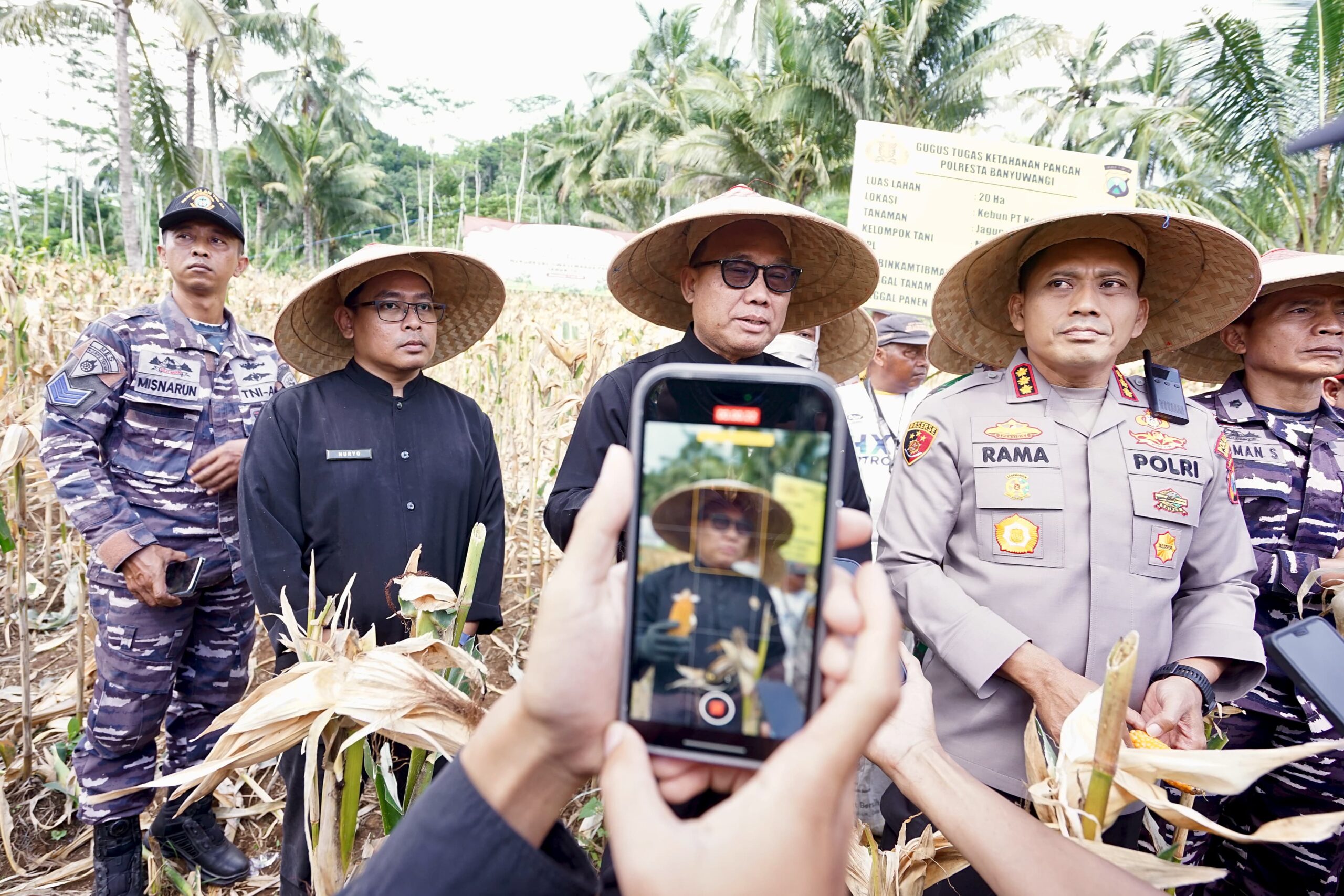 Panen raya tersebut dilakukan oleh Wakil Bupati Banyuwangi Mujiono dan Kapolresta Kombes Pol. Rama Samtama Putra. Turut mengikuti perwakilan Dandim 0825 Banyuwangi, perwakilan Danlanal dan Pimpinan Cabang Bulog Banyuwangi Dwiana Puspita.