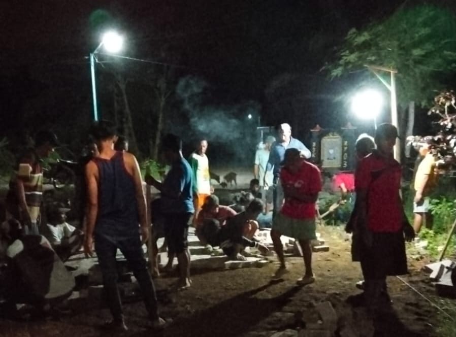 Ya, pemandangan tersebut terlihat saat warga Dusun Mulyoasri, melakukan paving dijalan setempat. Dibawah cahaya lampu, mereka kompak penuh semangat memasang satu persatu balok paving.